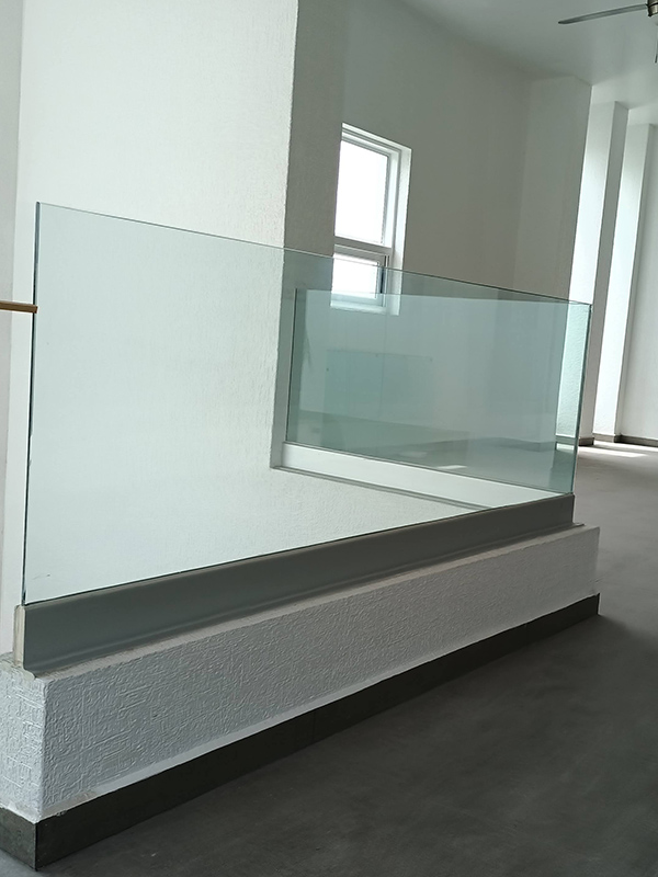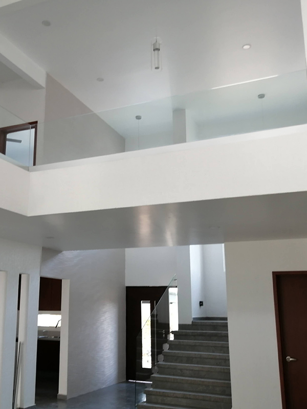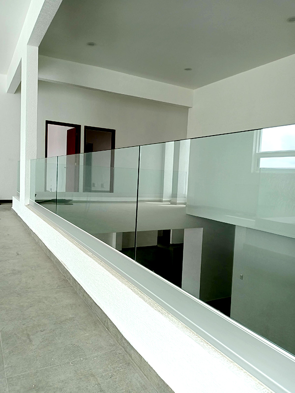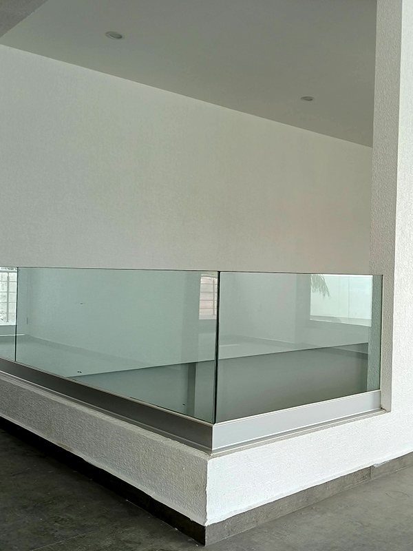 Barandal fabricado con pantallas de cristal templado de 10 mm anclado a loza con zocalo servilletero de aluminio al color del cliente, sin pasamanos con una altura total de 100 cm.