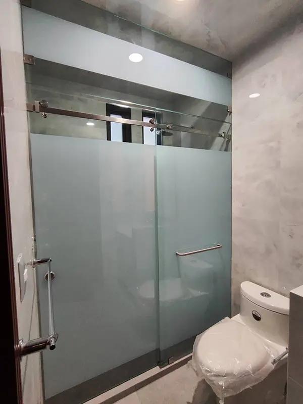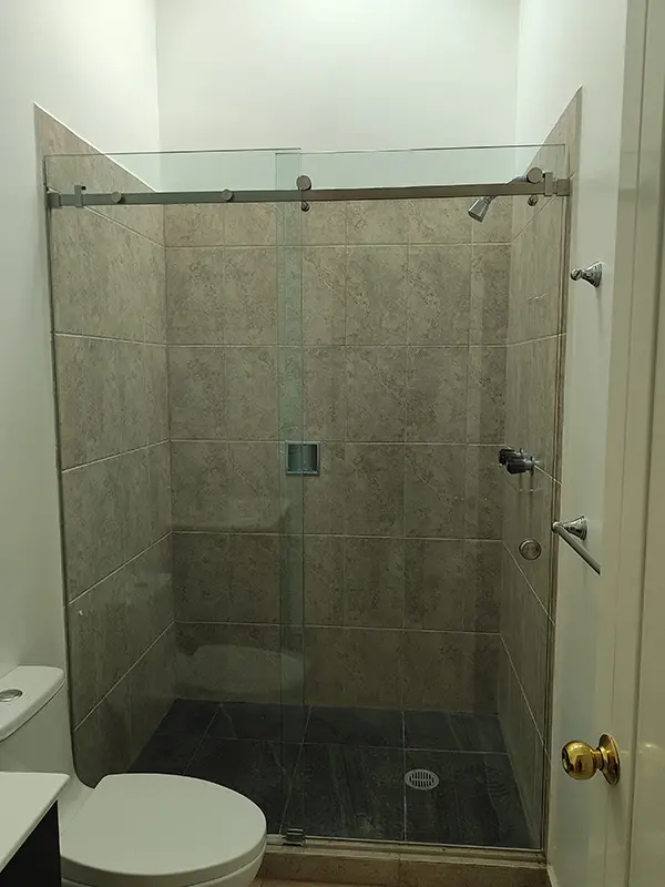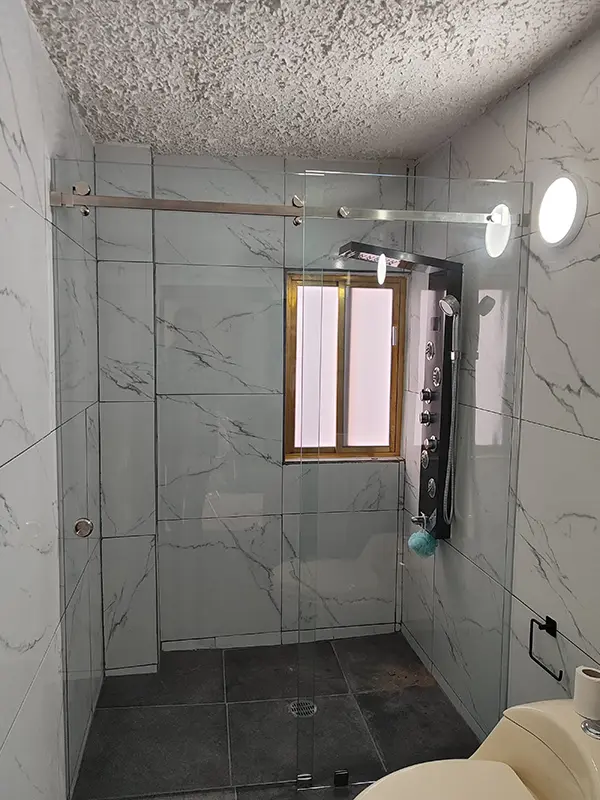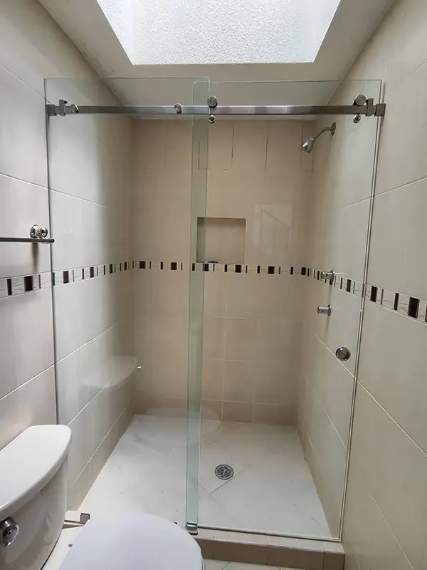 Cancel de baño fabricado con cristal templado 10 mm claro y herrajes de acero inoxidable que garantizan durabilidad y resistencia a la corrosion. Su diseño combina una hoja fija con una puerta corrediza, equipada con carretillas que permiten un deslizamiento suave y seguro.